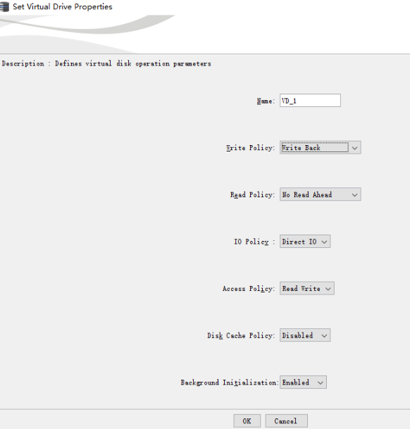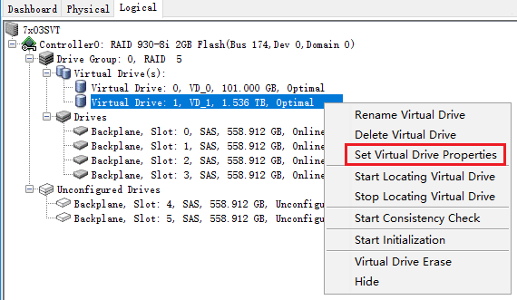 修改RAID卷参数设置 在Logical标签页中,右键点击要修改参数的Virtual Drive,选择”Set Virtual Drive Properties”。 在新窗口中就可以修改相关阵列参数,与创建RAID阵列时的类似。 如修改写缓存策略为强制回写模式,则将”Write Policy”修改为”Always Write Back”模式,然后点击”OK”。 文档导航← 删除RAID卷初始化RAID卷 → 我们要如何帮助您? 名称 邮件 Subject Message 评论 抢沙发 评论前必须登录! 立即登录 注册